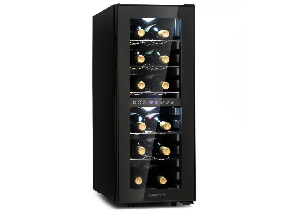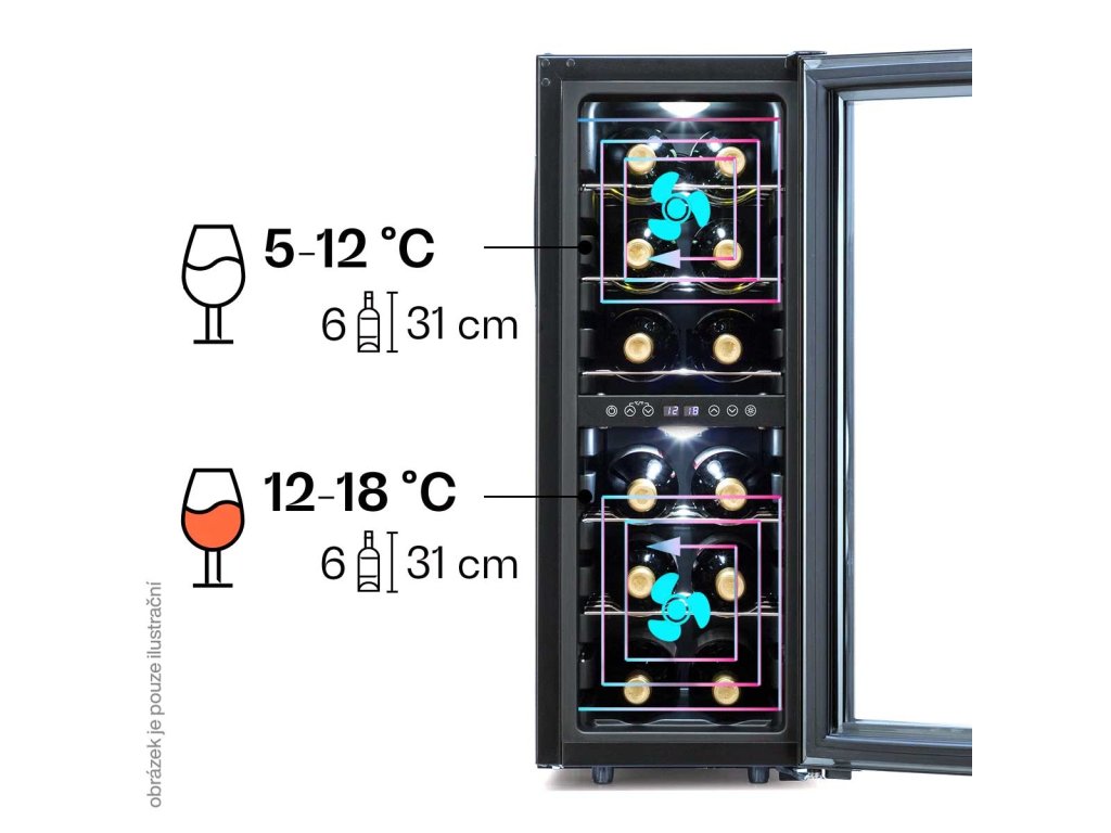 - Kapacita (počet lahví): 12 (standardní lahve o objemu 0,75 l / výška 31 cm)