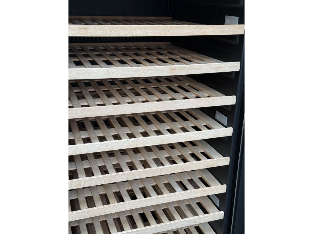 - vnitřní objem 425 litrů pro 165 vinných lahví na 13 policích z bukového dřeva